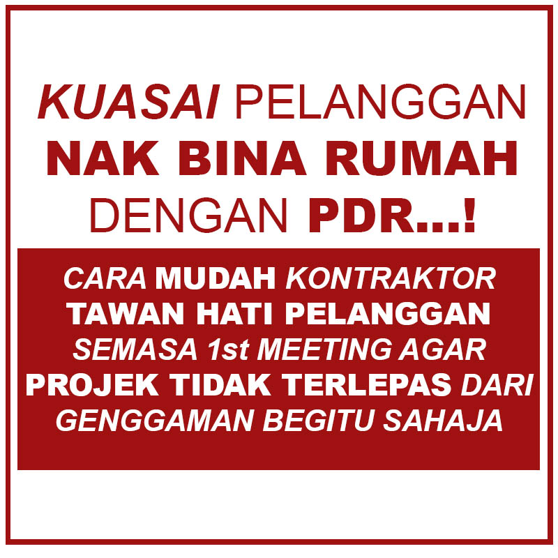 - PDR MEMUDAHKAN anda untuk ‘CLOSE DEAL’ dan mendapat projek bina rumah sebab lukisan design rumah yang ada dalam PDR disediakan oleh kami yang berpengalaman lebih 15 tahun dalam ‘residential architecture’.