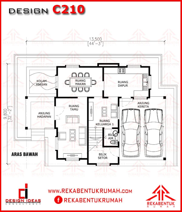 Bukaan Tapak/Luas Pelan Lantai = 44′ lebar x 32′ Panjang