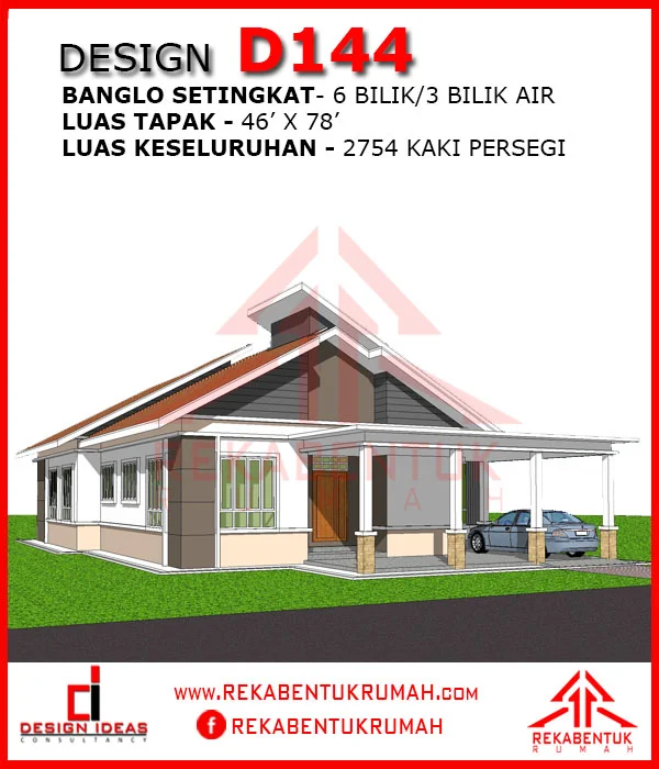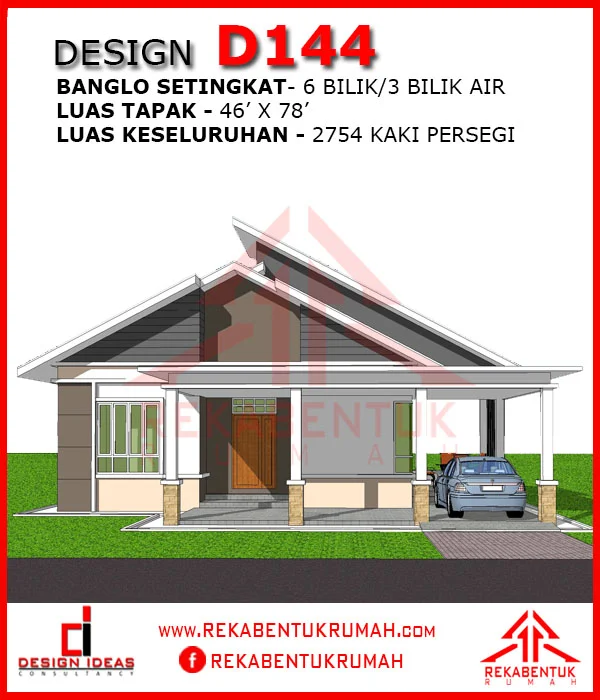 DESIGN RUMAH D144- PELAN RUMAH BANGLO 1 TINGKAT-6 BILIK (2754 KAKI PERSEGI-46’ X 77’)